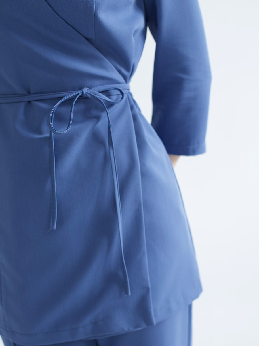 Ткань медицинской блузы матовая, гладкая, дышащая. Не прилипает, не электризуется, не утяжеляет. Блуза для медицинского персонала сохраняет глубину индиго стирка за стиркой — ни сдвига в серый, ни потери фиолетовой ноты.