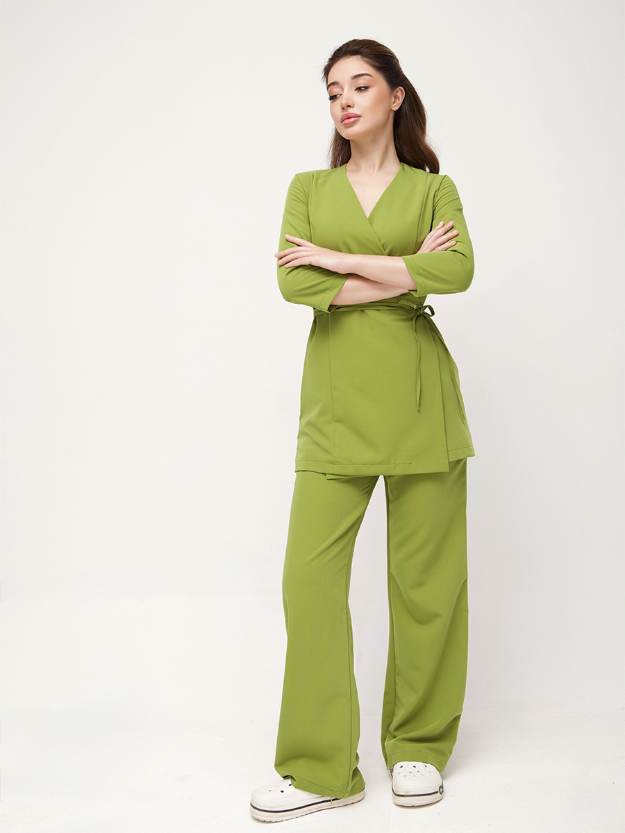 Ткань медицинской блузы невесомая, дышащая, гладкая. Двигаться легко, тело не потеет, блуза для медицинского персонала не мнётся. Пигмент закреплён в волокне — цвет лайм выдерживает десятки стирок без потери яркости.