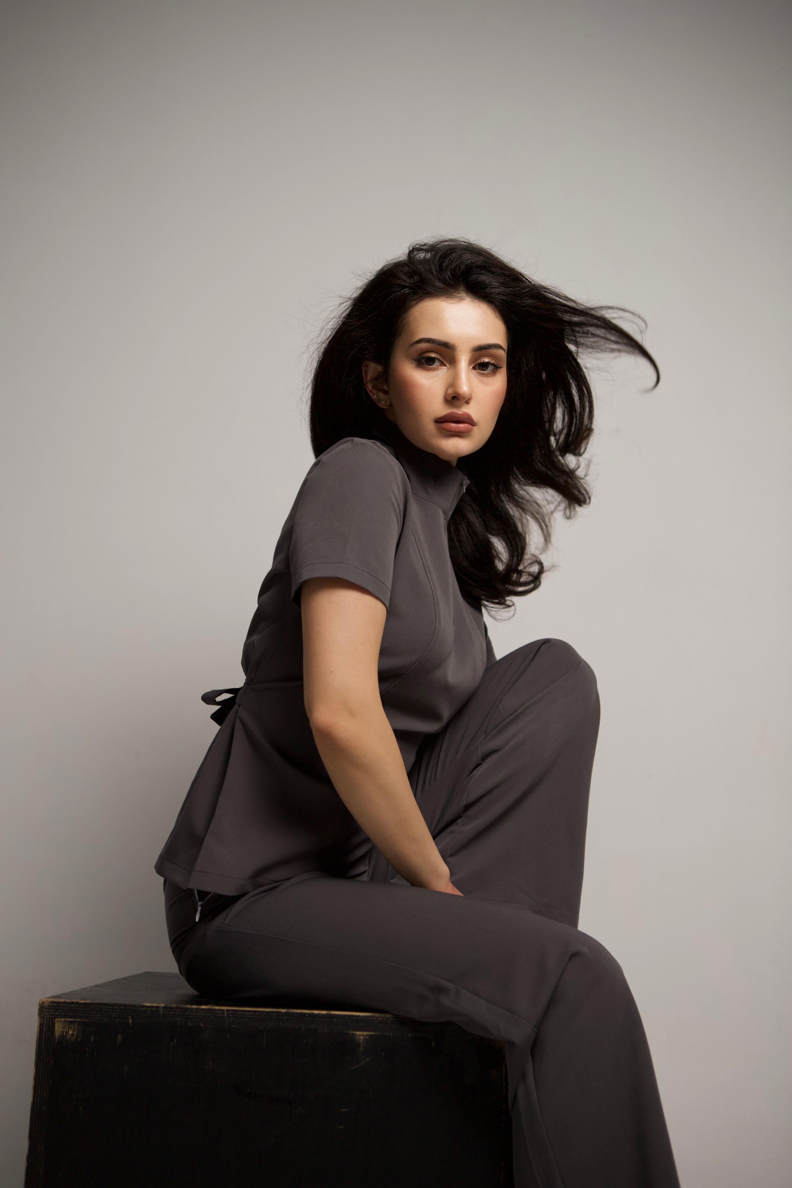 Ткань медицинской блузы дышащая, лёгкая, с гладкой матовой поверхностью. Не прилипает к телу, не электризуется, не просвечивает. После долгой смены блуза для медицинского персонала выглядит ровно так же, как в начале дня. Графитовый пигмент стабилен — ни выгорания, ни сдвига оттенка после многократных стирок.
