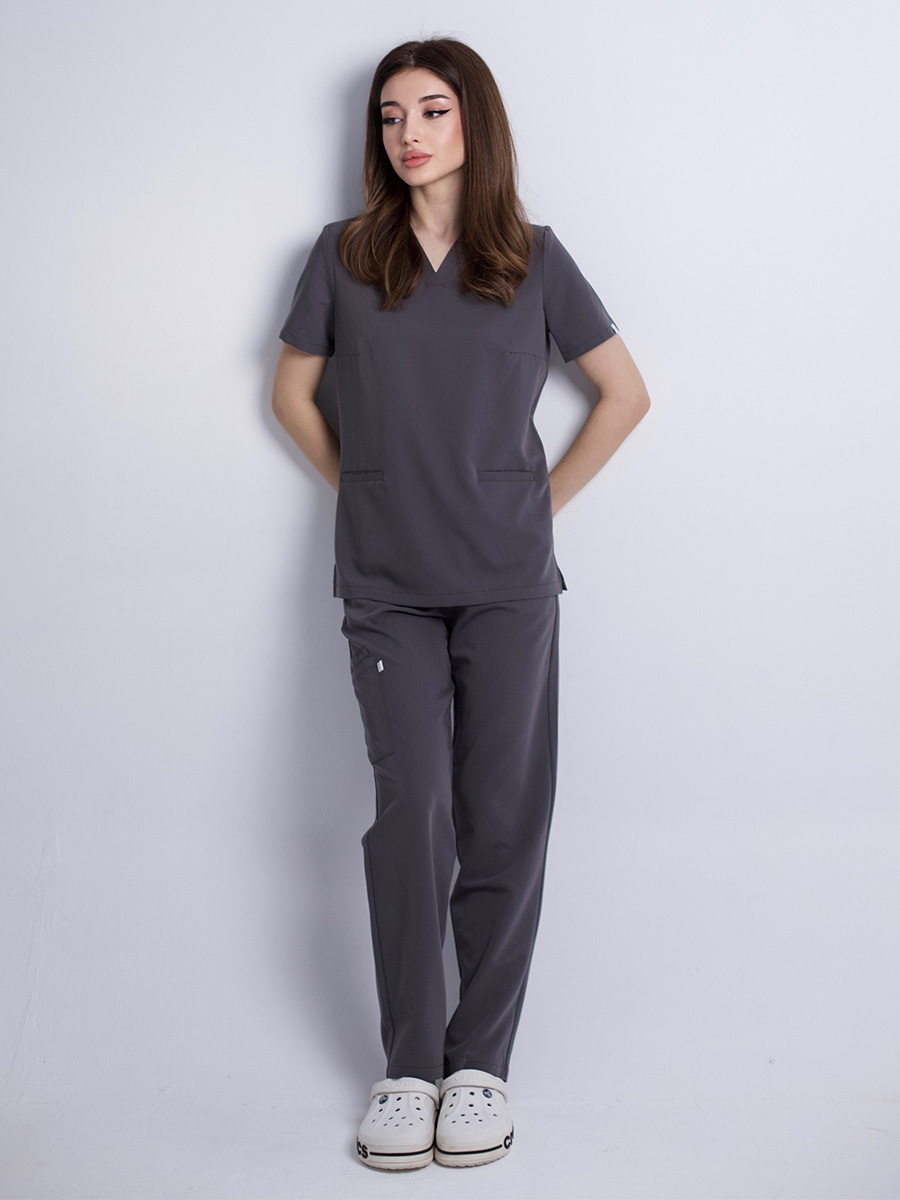 Базовый медицинский костюм Medici в графите — для тех, кому чёрный слишком категоричен, а серый слишком безлик. Графит попадает ровно между ними: сдержанный, интеллигентный, с лёгким металлическим подтоном, который по-разному раскрывается при дневном свете и под лампами кабинета. Вы выглядите строго, но без давления — пациент считывает уверенность и спокойствие.
