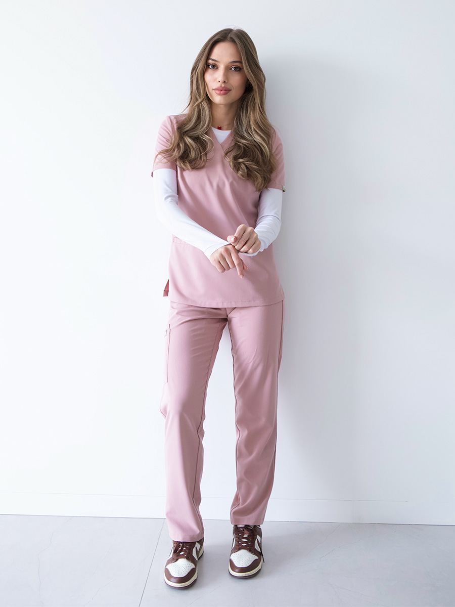 Розовый, который не кричит. Спокойный, чуть припылённый — он снимает напряжение ещё до того, как вы что-то скажете. Дети перестают бояться, взрослые расслабляются. Для педиатра, косметолога или стоматолога — идеальный рабочий инструмент, который надевается утром и забывается до конца смены.