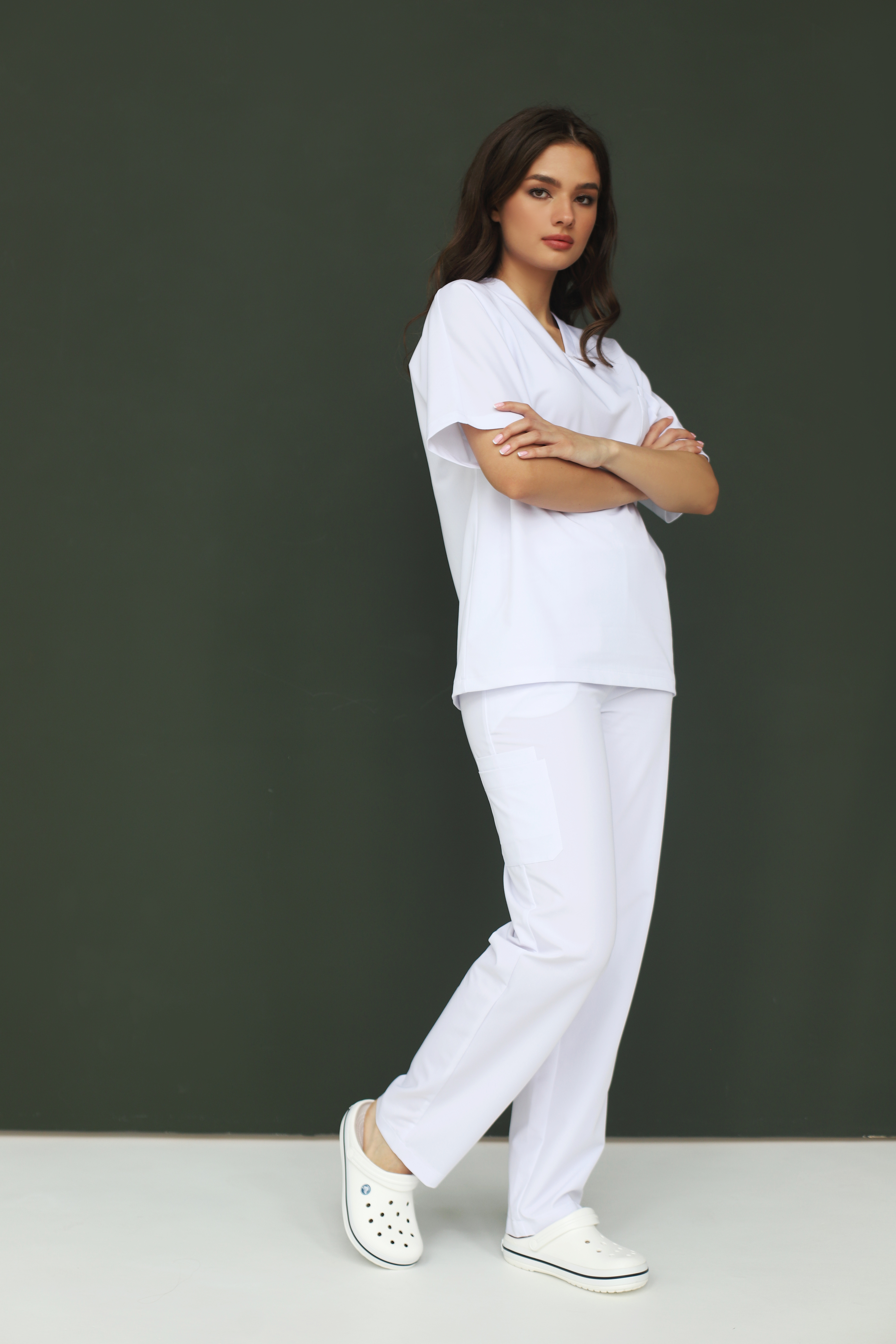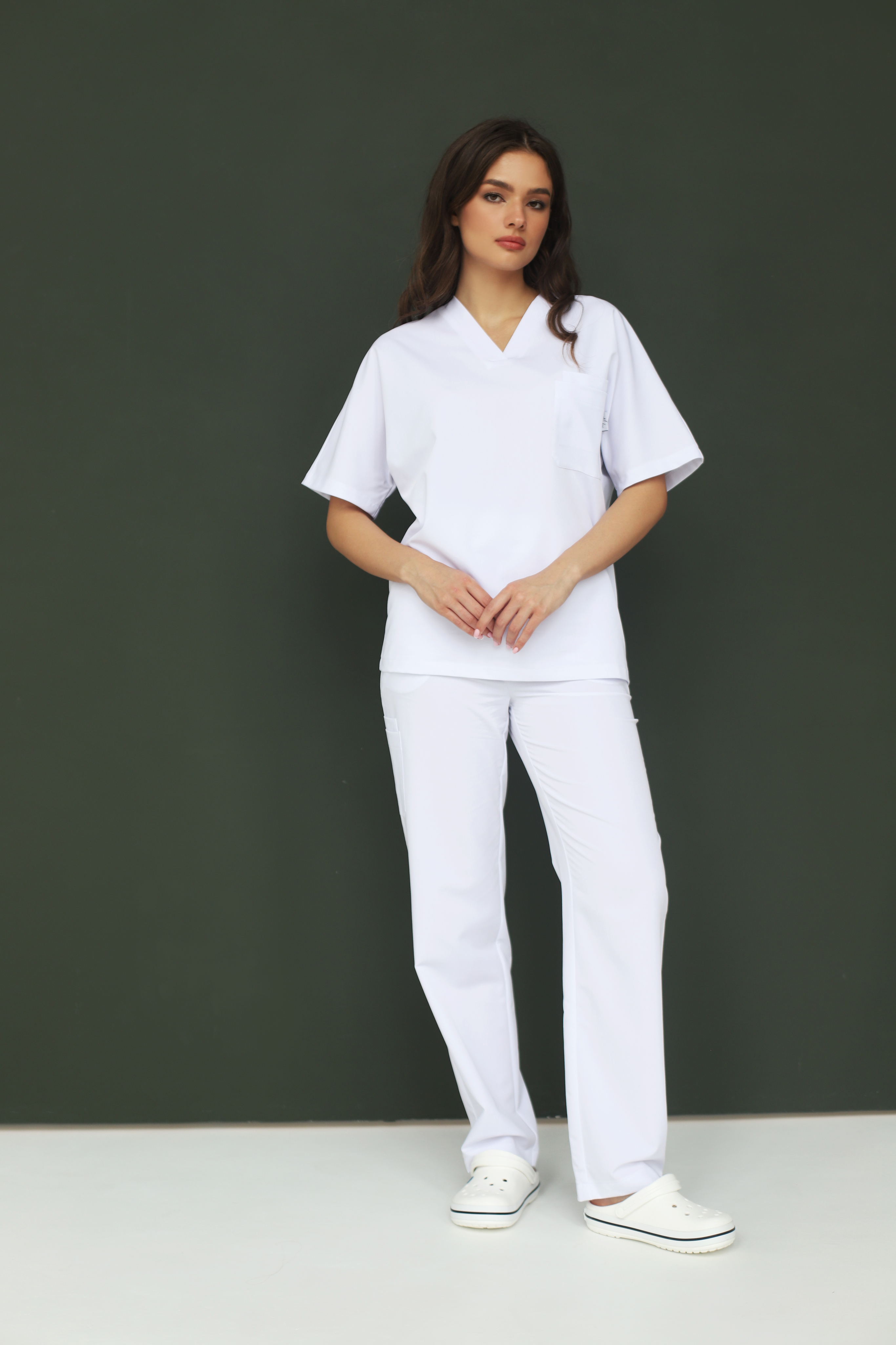 Белый — значит врач. Это считывается за секунду, без бейджей и пояснений. Но классика здесь заканчивается на цвете. Всё остальное — другая история. Свободный крой, спущенное плечо, расслабленный силуэт — белый халат в пересказе для тех, кому душно в прошлом веке.