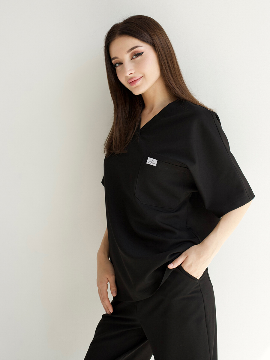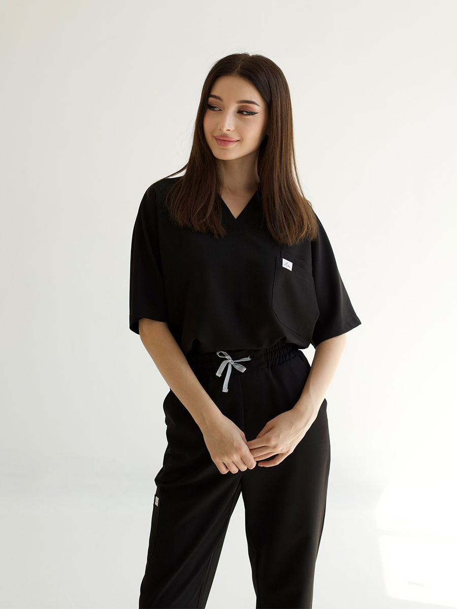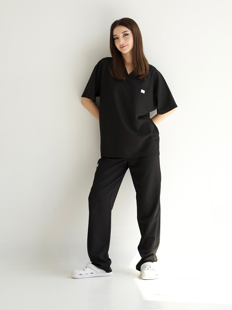 Цвет глубокий, без серого оттенка. Не линяет, не выцветает, не покрывается белёсым налётом. Чёрный, который остаётся чёрным — стирка за стиркой, смена за сменой.