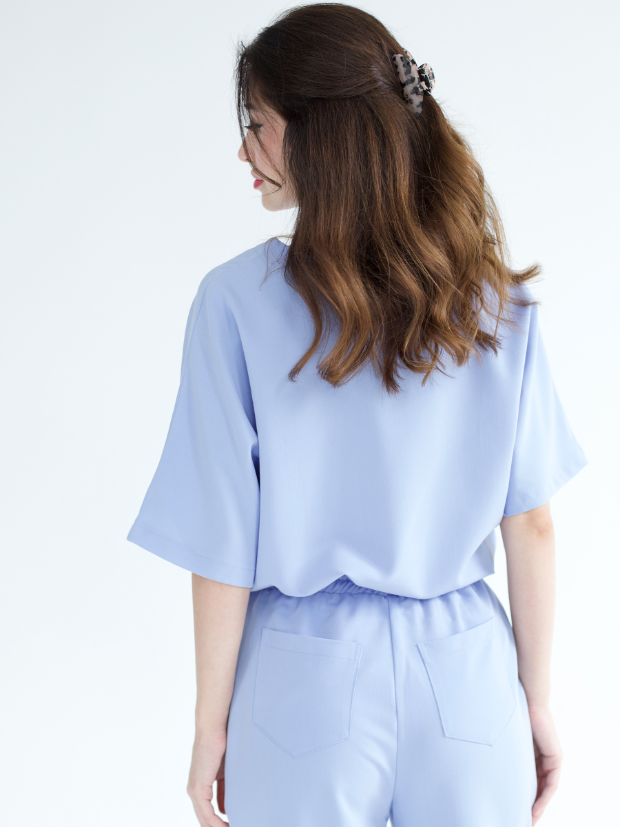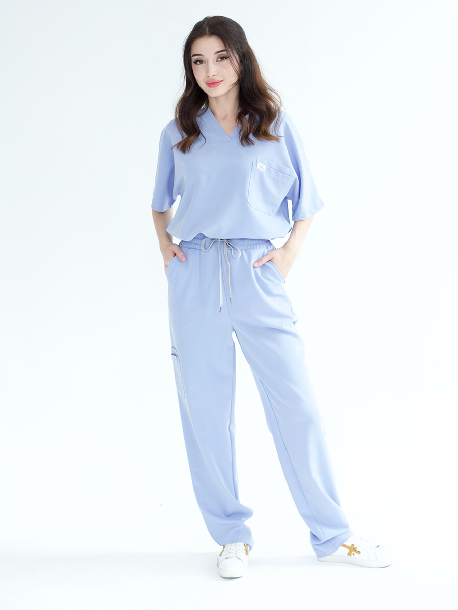 Свободный силуэт превращает привычный медицинский голубой в нечто новое. Убирает казённость. Добавляет лёгкость. Голубой на оверсайзе — это не больничная форма, а осознанный выбор. Тот же цвет доверия, но в современной подаче.