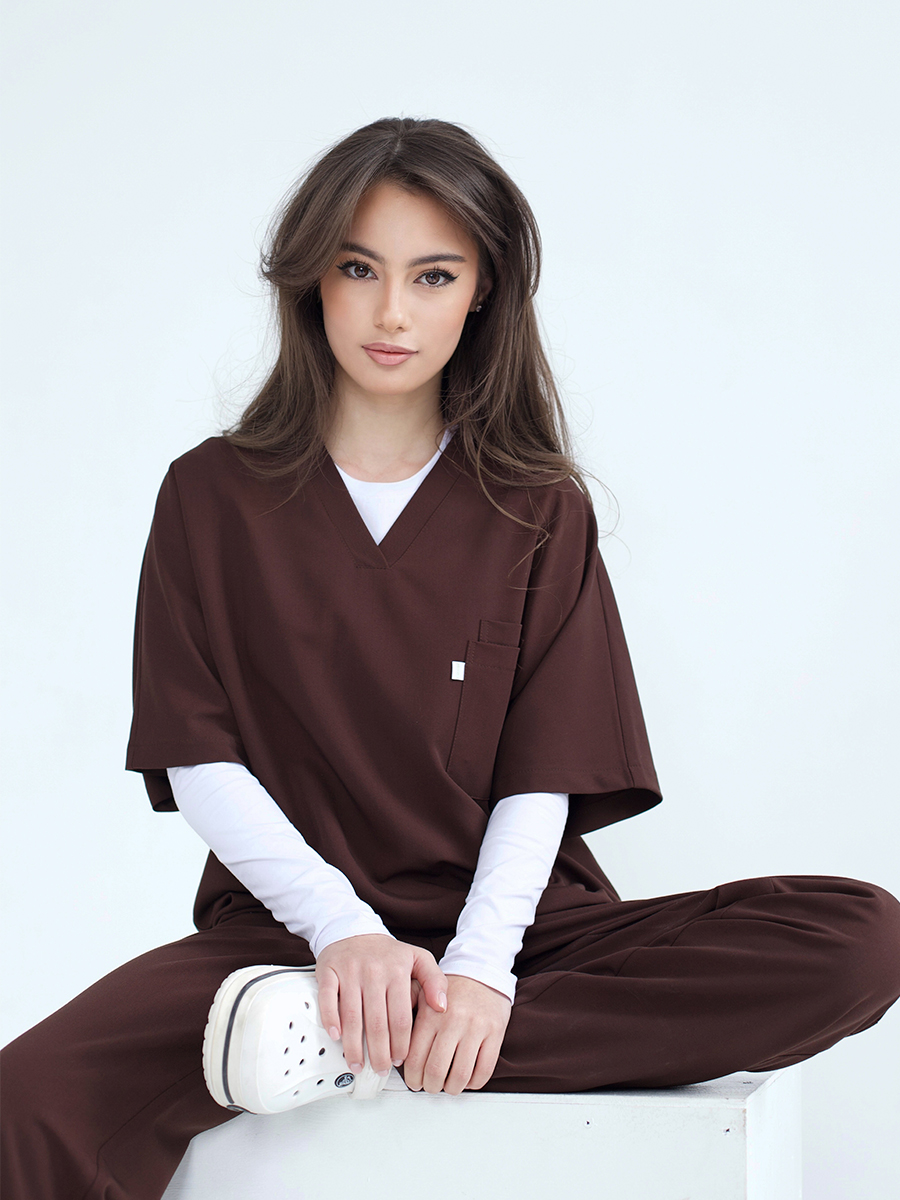 Светлый коричневый на свободном силуэте даёт ощущение уюта. Пациент расслабляется ещё в дверях. Для массажных кабинетов, спа-клиник, эстетической медицины — почти униформа, только без казённого привкуса.