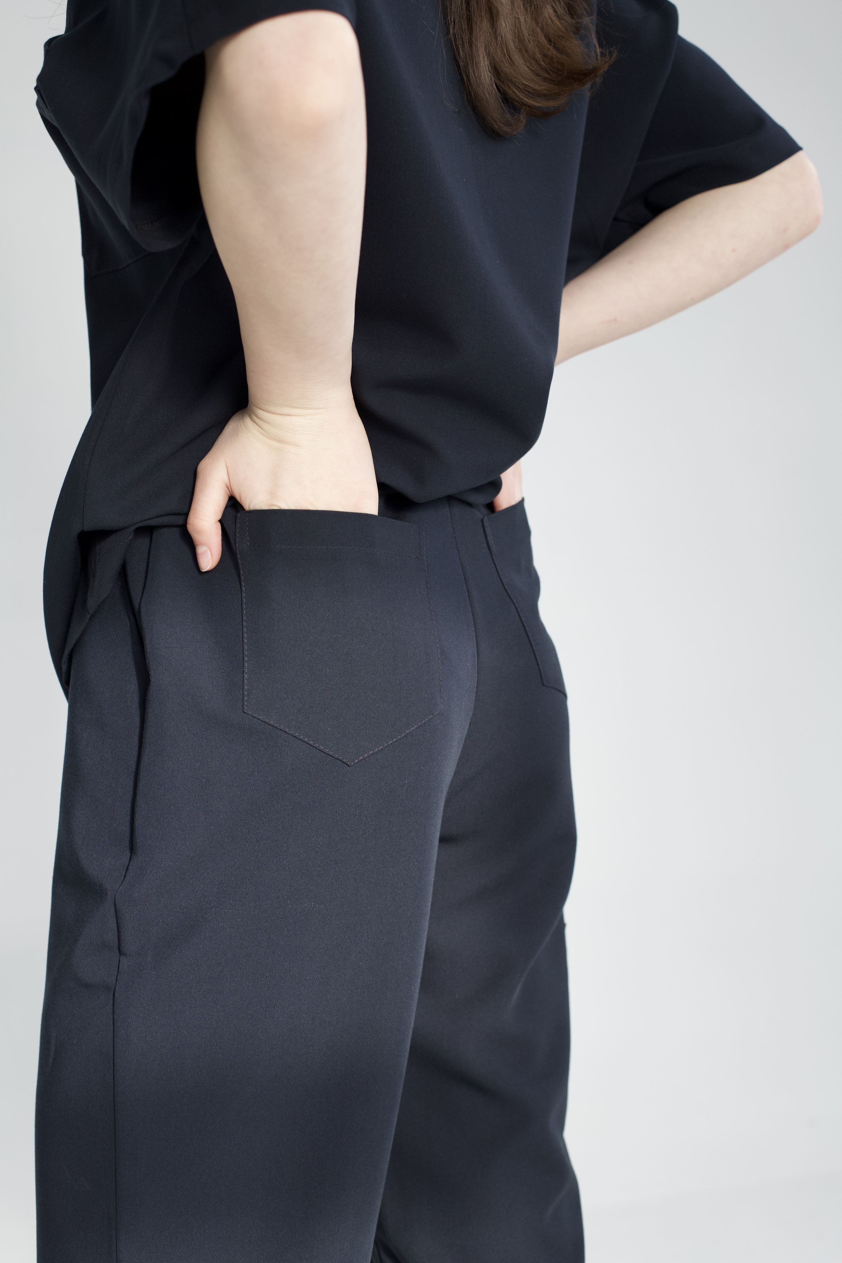 Шесть карманов скрыты в тёмной ткани так, что обнаружить их можно только рукой. Нагрудный для ручки — привычным движением. Боковые на блузе — не глядя. На брюках — глубокие, надёжные, тихие. Тёмно-синий хранит содержимое карманов так же, как хранит ваш авторитет — молча и безупречно.